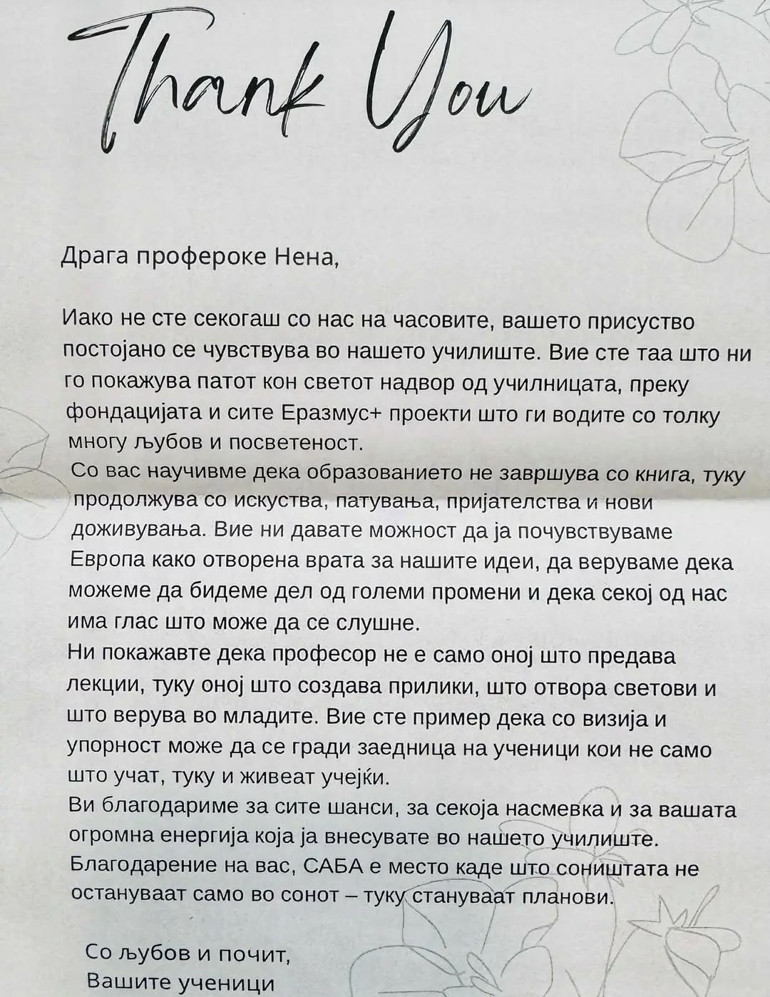 Кога знам дека сум им овозможила патување на млади луѓе и тие се враќаат презадоволни, добивам дополнителна енергија за да се заложам за што повеќе ученици, студенти, професори да одат на некоја мобилност, да ја претстават Фондацијата „Никола Кљусев“ и Македонија во најдобро светло и да им се прошират познанствата.